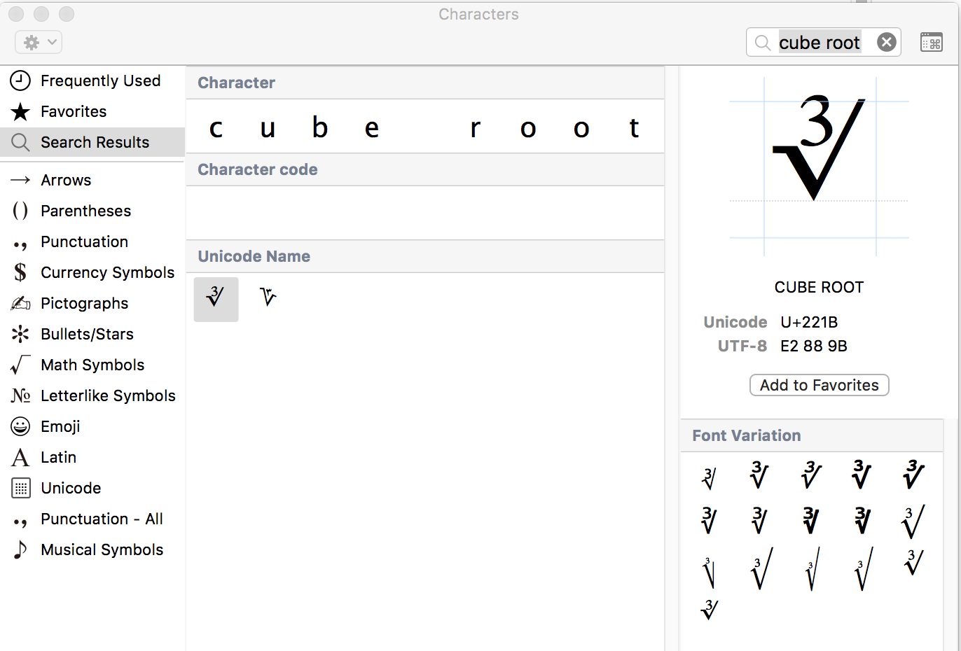 It also has the square root symbol alt code as well as the keyboard shortcut.